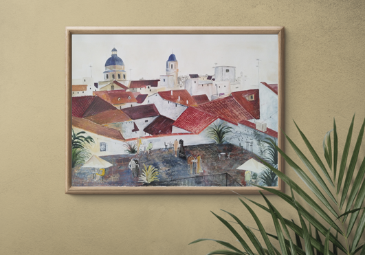 Desde la terraza Hat, en donde pueden disfrutarse de los tejados de Madrid y sus preciosas vistas.Técnica mixta: acuarela, gouache y pastel al óleo sobre papel. La lámina mide 68x88cm.