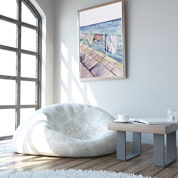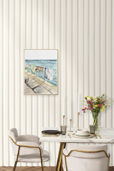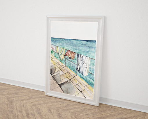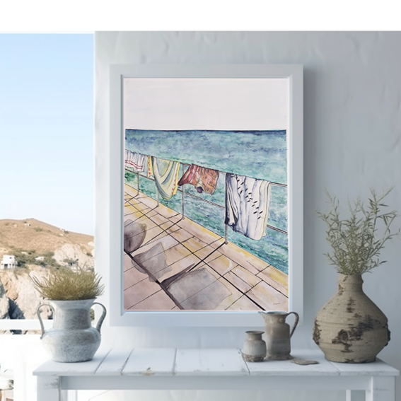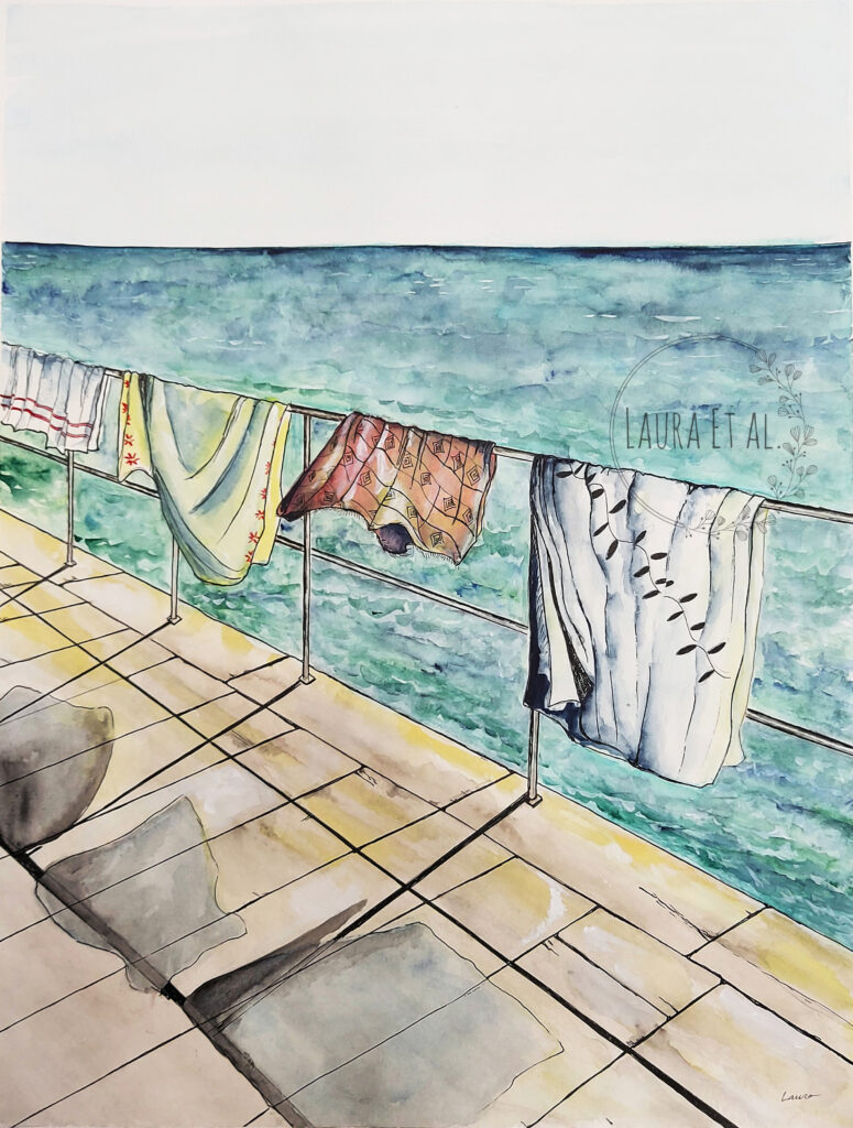 Después de un baño, un día de verano, las toallas se secan al viento. Acuarela sobre papel de algodón 100%. La lámina mide 65×50 cm