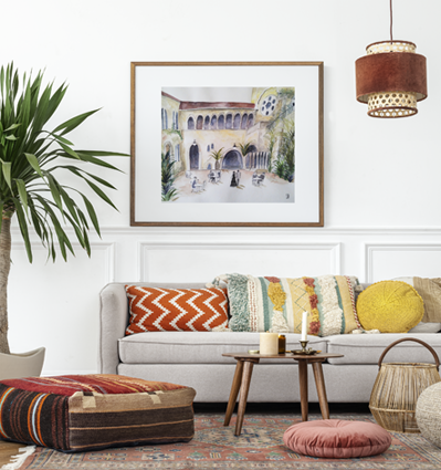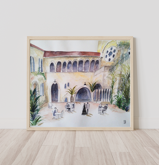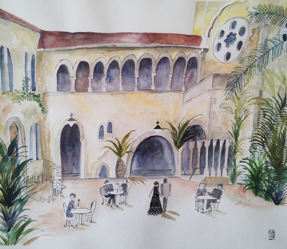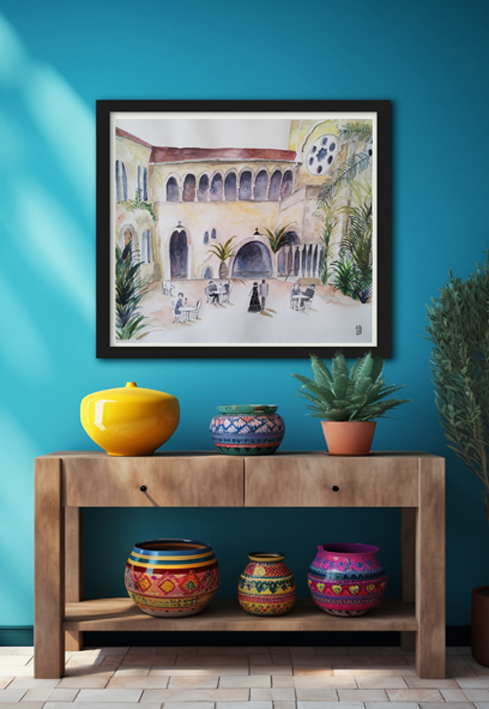 The Chapel El claustro de la Iglesia Evangélica alemana se transforma en un restaurante. 68×88 cm Acuarela sobre papel.